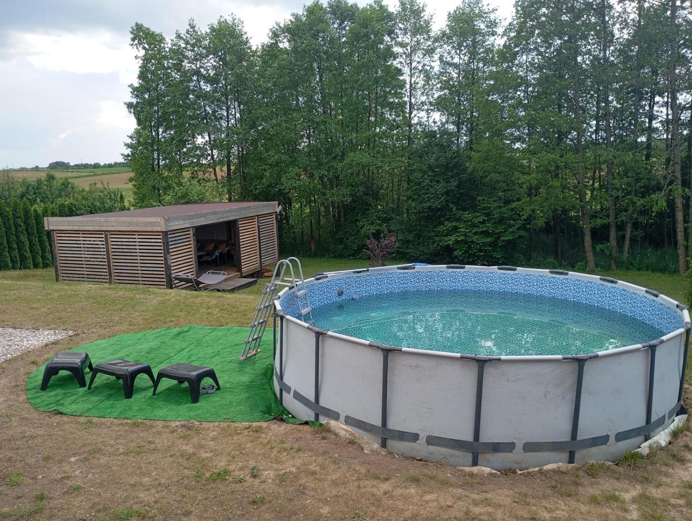 Dom wakacyjny. This holiday homes standout features are the private pool and fireplace. This holiday home includes 1 living room, 2 separate bedrooms and 1 bathroom with a shower. Guests will find a stovetop, a refrigerator, kitchenware and a toaster in the kitchenette. The holiday home also features a barbecue. The holiday home has a terrace with outdoor furniture and garden views to relax in after a busy day. The unit has 3 beds and 1 futon. Dom wakacyjny - 7 osobowy. Powierzchnia pokoju ok.: 40 mkw.